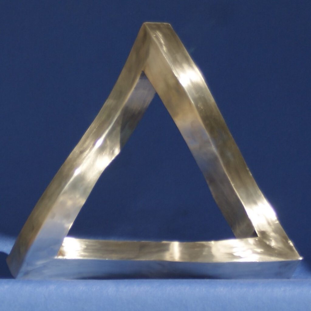 Stainless steel sculpture of a real constructed Penrose triangle, precisely aligned in perspective, polished surface.